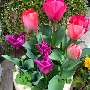 チューリップが咲きました⸜🌷︎⸝ ミックスで色は咲いてのお楽しみだったのが、紫💜と赤❤️でした。 ♬む〜らさきさん、む〜らさきさん、お首が短いのね💜 そうよ、姉さんもみーじかいのよ〜♬ 紫の方は揃ってお首が短かったです😅 そういう種類なのかしら❓ 雨降りの日曜日、久しぶりに帰省します。 姉妹全員揃うのは9ヶ月ぶりです😊