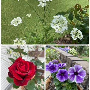 咲き始めたペチュニア 2種🌼 水やりのホースを引っ張るのと巻くのが大変🥺と旦那様に懇願し、庭の中心までホースを這わせてもらいました😊✨ クルクルホースの付け外しだけになったので、かなり楽に水やりできそうです😆✊🏻