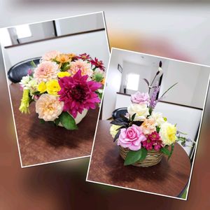 こんにちは😊 残暑が続きますが、今日から9月…今月もどうぞよろしくお願いいたします🙇💓 今日は、じいさまが1泊2日の初ショートスティへと出かけていきました⤴️⤴️ 呼び出し電話があれば行かなければいけませんが、私たち夫婦も、ようやく遅れて夏休みがとれます😌👌 1枚め…ダリア💓 オレンジ色のダリアの蕾が次々に上がり咲き出してきました⤴️⤴️ 2枚め…またまたダリア💓 3枚め…赤いダリアたち💓 同じように見えますが、右→大風車(大輪)、左上↖紫月(中大輪)、左下↘NAMAHAGEマジック(中大輪)✨ 4枚め…ピンク🩷のフロックス✨ 春先に、フロックスナターシャ🩷、ネオンフレア🩷、アナスタシア🩷をそれぞれ1ポットずつお迎えしました😉👌 名前はチグハグになったけど、それぞれに咲いてきました⤴️⤴️ 5枚め…フラワーアレンジ💓 今日はシンプルに…😌👌 素敵な1日を過ごしましょう♡(> ਊ <)♡⤴️⤴️