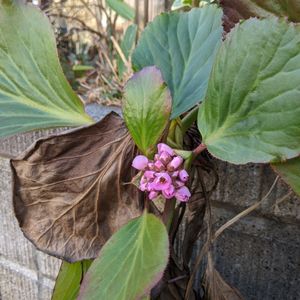 ヒマラヤ雪ノ下(ヒマラヤユキノシタ) ユキノシタ科ベルゲニア属の多年草。東アジア〜中央アジア原産。明治時代初期に鑑賞用として渡来し、庭や花壇、鉢植えなどで栽培される園芸植物。高山植物なので乾燥や寒さに強いが、暑さや多湿に弱い。丈夫で育てやすいので、株分けにされてあちこちで見られる。草丈10〜60㎝で、地上に出る太い根茎に厚くて丸い光沢のあるうちわのような大きな常緑の葉をつける。葉は寒さにあうと紫紅色を帯びる。冬の紅葉した草姿も美しく、切り葉としても利用される。花期は2~5月。日だまりでは2月頃から花が咲く。高さ20〜30㎝の花茎に淡紅色あるいは白色の花が多数集まってつく。別種どうしの交雑種も多く作られているが、どれも区別せずヒマラヤユキノシタの名で流通している。 出典『都会の草花図鑑』『色と形で見わけ散歩を楽しむ花図鑑』『花の事典 970種』