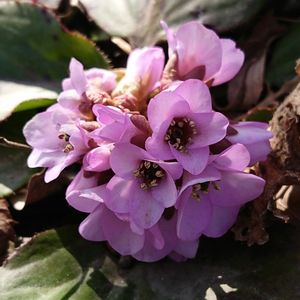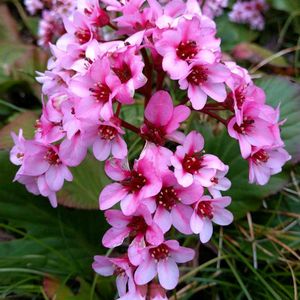 ヒマラヤ雪ノ下(ヒマラヤユキノシタ) ユキノシタ科ベルゲニア属の多年草。東アジア〜中央アジア原産。明治時代初期に鑑賞用として渡来し、庭や花壇、鉢植えなどで栽培される園芸植物。高山植物なので乾燥や寒さに強いが、暑さや多湿に弱い。丈夫で育てやすいので、株分けにされてあちこちで見られる。常緑の葉はしゃもじのような形で厚く艶がある。花期は2~5月。高さ20〜30㎝の花茎に淡紅色あるいは白色の花が多数集まってつく。別種どうしの交雑種も多く作られているが、どれも区別せずヒマラヤユキノシタの名で流通している。 出典『都会の草花図鑑』『色と形で見わけ散歩を楽しむ花図鑑』