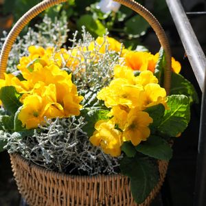 素敵な寄せ植えをいただきました。 お店で購入されたお品です✨ 鉢いっぱいにお花達が入れてあります。 真ん中にシルバーリーフ、端に水苔が入っています。 本格的な寄せ植えは初めてなので、枯らさないように、さっそくスマホで調べています。_φ(・_・