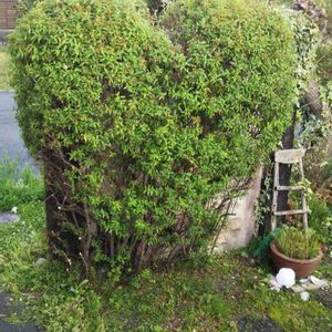 花の終わったゆきやなぎが、ものすごい勢いで繁り出したので夫に剪定を頼みました。 満開になるとなかなか見ごたえがあるので、来年のためにトトロ風にカットをおねがいしました。 …が、仕上がりを見たらハート型に😅。 ま、いっか。