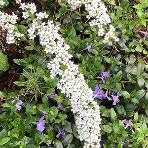ユキヤナギとヒメツルニチニチソウ。 スギナが邪魔ですね。😣