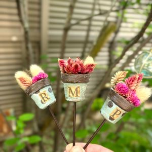 気まぐれクラフト 一寸鉢を使ったガーデンピック こんなのはどうですかー? 鉢の中にはドライフラワー用の オアシスを入れて 自分の好きなドライフラワーを挿してもらったら楽しいかなぁと 色々試作中☺︎ 時々迷走してます🤣
