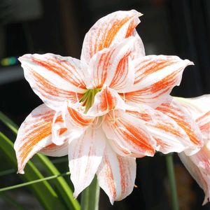 今日のお花 ✼アマリリス ヒガンバナ科 ➀八重咲き ➁真紅色❣ ➂ふっくら蕾がほころび始めています ➃𓂃➄バイカラー🤍❤