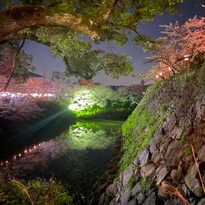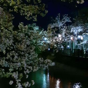 夜桜 🌙*゚ ライトアップされた夜桜.。.:*🌸 池に写って、とっても綺麗✨