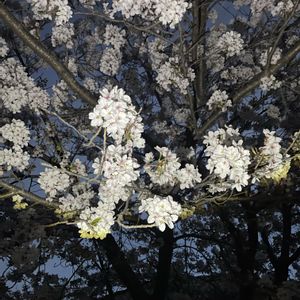 庭から街路樹の夜桜を 眺めていました🎶 散る花びらも素敵です。 二枚目は少し前の 満開の夜桜です。