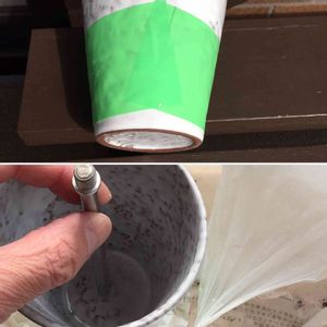 夏対策2重鉢作り(2)水抜き穴をあける。 カップの外側にグルリとテープを巻いてから、とがった金属棒をトンカチで一撃!