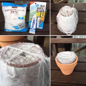 夏対策2重鉢作り(6)内鉢・外鉢を合体。 1:シリコン充填剤と100均の三角コーナーネットを用意。 2:内鉢にネットを2重に被せて、 3:内鉢底のフチにシリコン充填剤を盛り、 4:外鉢にグイッと入れて出来上がり!