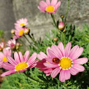 うちのマーガレット、咲き始めました❤️かわいいなぁ~(*≧з≦) お客さんもおりました😃🎵 🐞さん、今日は暖かかったけど、これから冬ですよ。。。