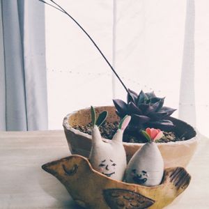 緑の寄せ植え。お部屋用。 双子とりさんピックが可愛い💕