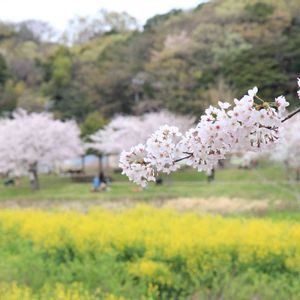 お花見〜🎵奥は筑波山です。 今年は 旦那君と行けました♡ 曇ってたけど ぽかぽかで気持ち良かったなぁ🎵