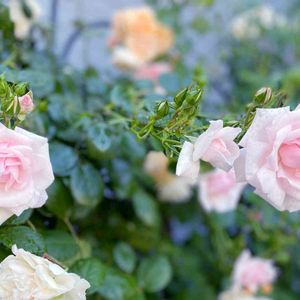 ロサオリエンティス ダフネ 波打つ花弁は淡いピンク色からベージュ色に退色する魅力的な🌹 病気にも強く花持ちも凄く良いです♡ クレマチス白万重とオデュッセイア🌹