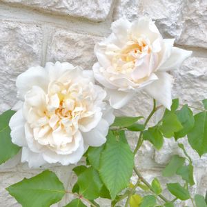 つるバラ マダムアルフレッドキャリエール 薄いピンク色でふわっと咲きます 鉢植えですが、今年のお花は小さめでした💧 背景は夫が製作したこだわりのレンガサークル