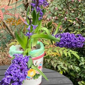 玄関の靴箱上に置いているヒヤシンス 満開になりつつ凄い角度がついてきたのですが💦 皆様のお宅のはいかがでしょう? 3つある球根の各々最初に出た花が このように曲がっていくのは😵🤔🙄