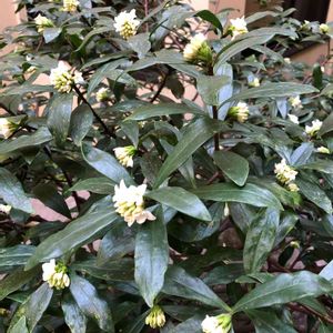 💕沈丁花💕 もうすぐ、もうすぐ咲きますね😊 日陰なので斑入り葉がほとんど緑〜 細〜く周りに白い線があるだけです😅