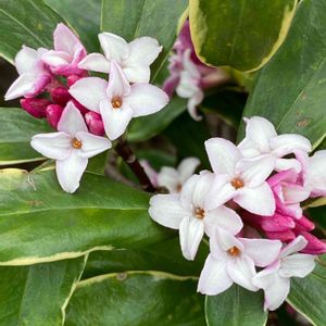 覆輪ジンチョウゲです。 葉のまわりが黄色く縁取られることから覆輪(ふくりん)の名がつく。 秋の金木犀のように芳香放ちます。枝先に小さな花が手毬状に固まってつきます。