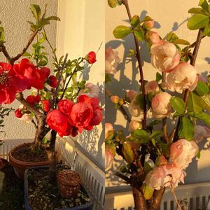 おはようございます😃 今日の一枚は見頃になった木瓜達です💕 昨日はテレワークなのをいいことに、一日中盆栽と多肉の植え替えしました。 20鉢くらいやりましたが、まだ20鉢くらい残ってます💦 残りは来週末…木瓜と桜は秋ですね。 ずっと同じ姿勢だったので、腰が痛いです😅