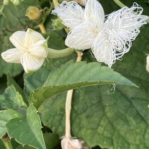 おはようございます╰(*´︶`*)╯♡ この季節になると 気になる烏瓜 6時半 夕方散歩 陽が高い ギンギラじゃ まだ咲かない🥲 ①②は雄花実にはならない✳️ ③④こちらは雌花✳️ 可愛い烏瓜の実が! 蕾の段階から子房有り❇️ ああ 7時過ぎれば観られるはず 😗😞🥵 ⑤畑の鉢植えの金柑 遅らばせながら やっと花が 柑橘系の花は香りが良い❇️🍊 🏷️白い水曜日♡ 参加します♪