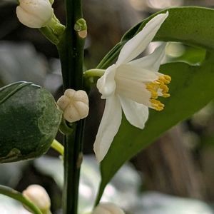 金柑の蕾とお花、蕾はプックリとして可愛いらしく、お花は純白で、柑橘系のとても良い香りがします…ずっとお鼻を近づけてクンクンしています〜✨️🧡🤍🧡🤍🤭 🏷金曜日の蕾たち、参加させて下さい🤍