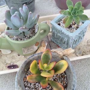 お気に入りの四角い鉢… 二月の寒い日に屋根の無いベランダに出しっ放しにしてしまい幾つか⭐︎に… (/ _ ; )。 暫く隙間だらけの寂しい鉢を眺めながらどう寄せ直すか考えていましたが、 今日、花粉舞う中⁈頑張ってね寄せ直しました。 幾つか植え込み待ちの子もやっと仲間入りです💕 これからはどんどん暖かくなるので、 元気に根を張ってくれると良いな💕 姫黄金花月…宇宙を感じます⊂((・⊥・))⊃ どの子と合わせようかな?個性が有り過ぎで⁈なかなか出番を見つけられないで いましたが、 合わせてみると案外面白く、役割を果たしてくれてる感じです(o^^o)。 霜の朝中心に大好きな黄麗、右奥にはブロンズ姫。お気に入りのひと鉢になりました✨ もう少しモリモリして来たら上からもお見せしたいな✨ 先日ご近所さんから頂いた七福神さんらしきベビーちゃんもおまけに挿しときました。
