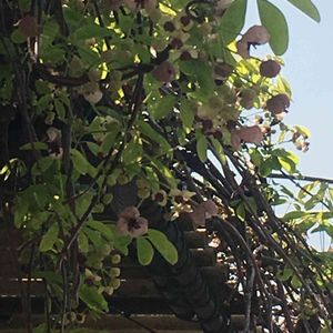お散歩中の公園で藤棚を見上げると可愛いお花❣️ 白からピンクのグラデーションで咲いていました😊 名前教えていただきました😊 アケビの花との事です😆