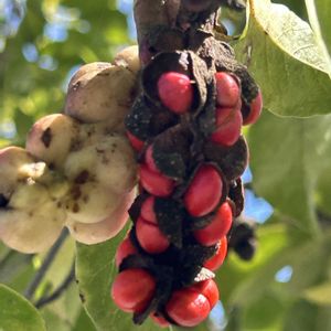 ピンクの実から飛び出すオレンジの種。 色は綺麗ですが異様な姿。