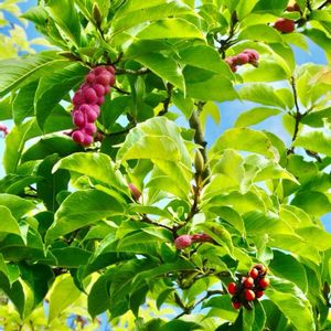 ①拳を握りしめたような果実の形が名前の由来だそうですが、これほどボコボコの果実が他にあるでしょうか😳 10個くらいの袋果の集合果だそうです 整列せずにこの形になった訳があるんでしょうね🌳 秋には裂開して真っ赤な種子が糸を引いて垂れるそうです➰🔴➰🔴➰🔴 見逃さないように見てみたいです😃 ②葉に隠れて実が大きくなっていました🟢 黄色くなる頃は葉も落ちて涼しい秋風が吹くでしょうか🟡🌀🍂