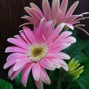 何日か前に投稿したミニガーベラに、三つ目の花が咲きました。🎶 しかし、なぜか、白っぽさが強い花いろに。 それは、それで、可愛いですが。😁💓💕