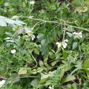 コマツナギのピンクに続いて、白が咲きました。😃🌼 回りの雑草に絡まれて、紛れていましたので、 頑張って、周りの雑草を抜いてきました。 暑くて、脱水になりそう‼️🤯😵🥤🥛🍧