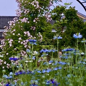 今日の庭の様子 ①バラとニゲラ ②ユキノシタ ③ニゲラ ④ブラキカルブラスコ ⑤オステオスペルマム