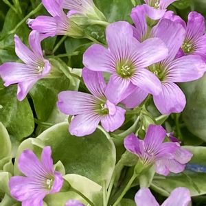 今朝の庭の様子 ①ムラサキカタバミ ②カワラナデシコ ③オルレア ④バーベナ ⑤サツキ