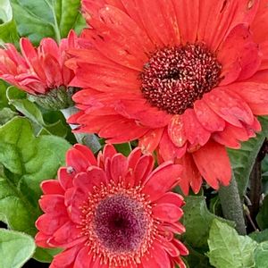 今朝の庭の様子 ①ガーベラ ② ネギボウズ ③スーパーバーベナ ④ペチュニア ⑤ゼラニウム