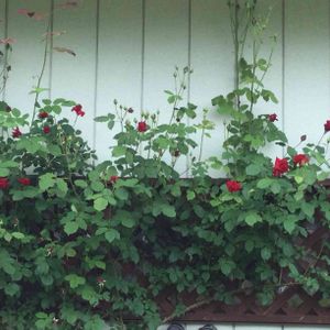外壁のラティスの薔薇 蕾が沢山付きました ベルベットの様な真っ赤な薔薇です 毎日 眺めているので照れてるかも