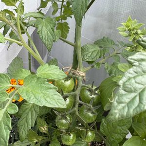 ミニトマト 千果とイエローアイコ 色づいてきました 昨年、一昨年はあまり収穫できず😭 が、今年は期待できそうです 千果は実がたくさんついてます 収穫が楽しみ😍