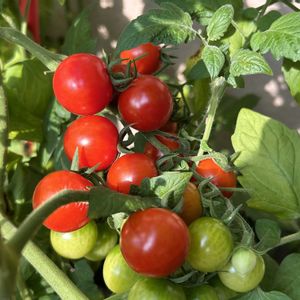 種からの✨ミニトマト✨ʚ🍅ɞ 赤くなってきました😋 房ごと赤くしたいです🤭 鳥に食べられませんように 庭の鉢植え3鉢 1枚目🍅スイーツカリーノドルチエ 2枚目🍅千果 3枚目🍅チョコアイコ 4枚目3月1日 5枚目2月1日リビングで播種🤭 赤くなるまで4ヶ月もかかってる 畑のを今日4個収穫😋