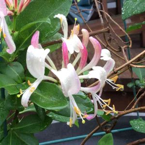 今日か今日かと思っていた ハニーサックルが咲きました 何度見ても不思議な花です もう少しで斑入りの株 ハニーサックルの白い花も咲きます
