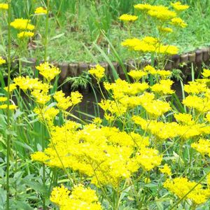 他に花が少ないせいか、一際輝かしいオミナエシ✨✨ 後ろには菖蒲の葉っぱ達が並んでます🌿