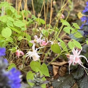 今日のお花にちなんで。 イカリソウ 多摩の源平 今春はじめましてのお花を見せてくれた まだまだ小さな苗です。 アジュガの花がジャイアントに見えるし🤣 ふわふわ揺れる花も葉もかわいい(✿◡‿◡)
