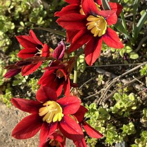 夕散歩🚲 ❶❷スパラキシス 赤いお花とオレンジと❤️🧡💛 鮮やかな花色❣️ ❸シラーペルビアナ 華やかなお花です💙💛 ❹白と黒のオシャレな野菜🤍🖤 AIによると、何とソラマメだそうな👀 ❺お隣りから子持ち蓮華頂きました お花のような子株?が可愛い💕