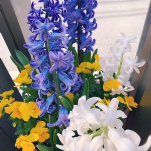 📮ポストの横の『配達ご苦労様』〜の気持ちの寄せ植え🌼🪴 ヒヤシンスが6本出始めて…😅💦 モリモリ過ぎてぐちゃぐちゃになって来た💧