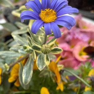 寄せ植えの後ろに植えた🌿 挿し芽の❁ブルーデージー❁が 1つだけですが❁咲いてくれました🧡💙🌿