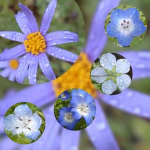 🏷水滴の水曜日 1000pic越え💙 おめでとうございます🥰 雨上がりはいつもは見えない素敵な様子が見えますね😂 右上の2番目はネモフィラの裏側😍 この子たちは種から頑張ってくれました💙 1番おっきなのは斑入りのブルーデージー💙 去年からのお花でずっと咲いてくれるので😂 ✄しづらい😂😂😂😂😂😂