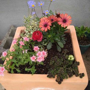 こんにちは☺️ 去年挿し木したブルーデージーにしっかり根が着きました🎵\(^-^)/ そこで数日前、家にあった植物で寄せ植えを作りました✨ 秋にはもりもり育ってほしいな🌼
