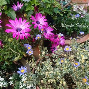 寄せ植え💠𖡼.𖤣𖥧𖡼.𖤣𖥧💠 今のところは、、 ピンクの寄せ植えです😃 オステオスペルマム フェリシア“スプリング•メルヘン” 両方共、ミックス種 なんとも可愛らしいピンクの寄せ植えになりました😊 まだ蕾の斑入り葉のブルーデージーは ブルーのお花ですけどネ😉