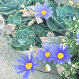 4ヶ月経ってやっとブルーデイジーが咲きました😃 ストックとミニシクラメンがねばり強く待っててくれました✨✨