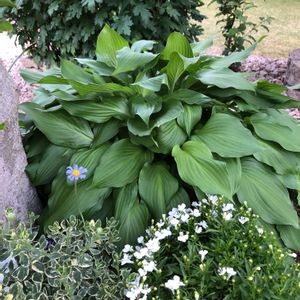 今朝、雨が降る前に☔️ モチノキの株元に先週、我が家に迎えたい「斑入り、ブルーデージー」と右の名前は? 何だったでしょうか? 去年、秋に花壇に植えて冬越しはしたけど、元気なくて、鉢上げして、どうにか回復✌️🎶 日中、日陰になり、雨もあたりにくい株元に移動しました‼️ 後ろの花壇は去年、挿し木して菊の花壇を作りました。今年はまだ、葉は綺麗なので切り戻しして、秋を迎える予定です(^^)