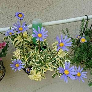 2年ぶりに咲いてくれた斑入りブルーデージー 次々と花が開いてとっても可愛い💙 外置きの朧月と七福神の寄せ植えと お隣でお互いに引き立てあってます🍀 華やかな花いろも好きだけど 緑色と青の組み合わせもステキでしょ💎