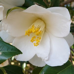 日中は晴れそうです。 椿 都鳥咲きました。 小さな鉢植えの椿ですが、 毎年、二、三輪咲いてくれます。 軽く中折れする真っ白な花弁がよいなぁ!